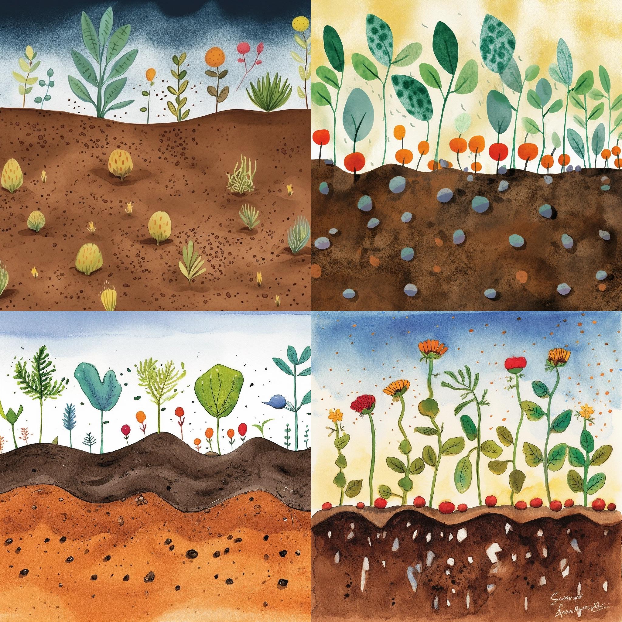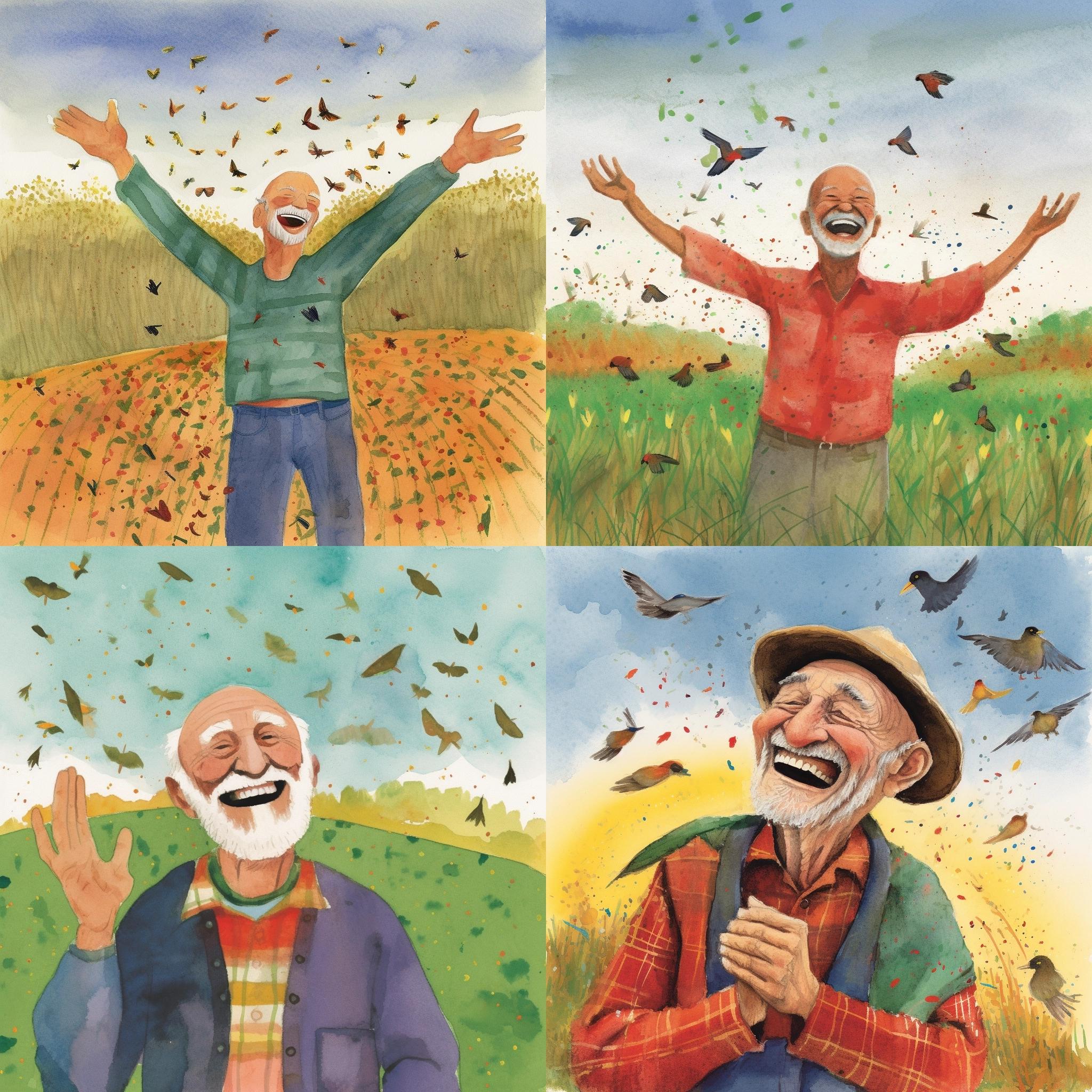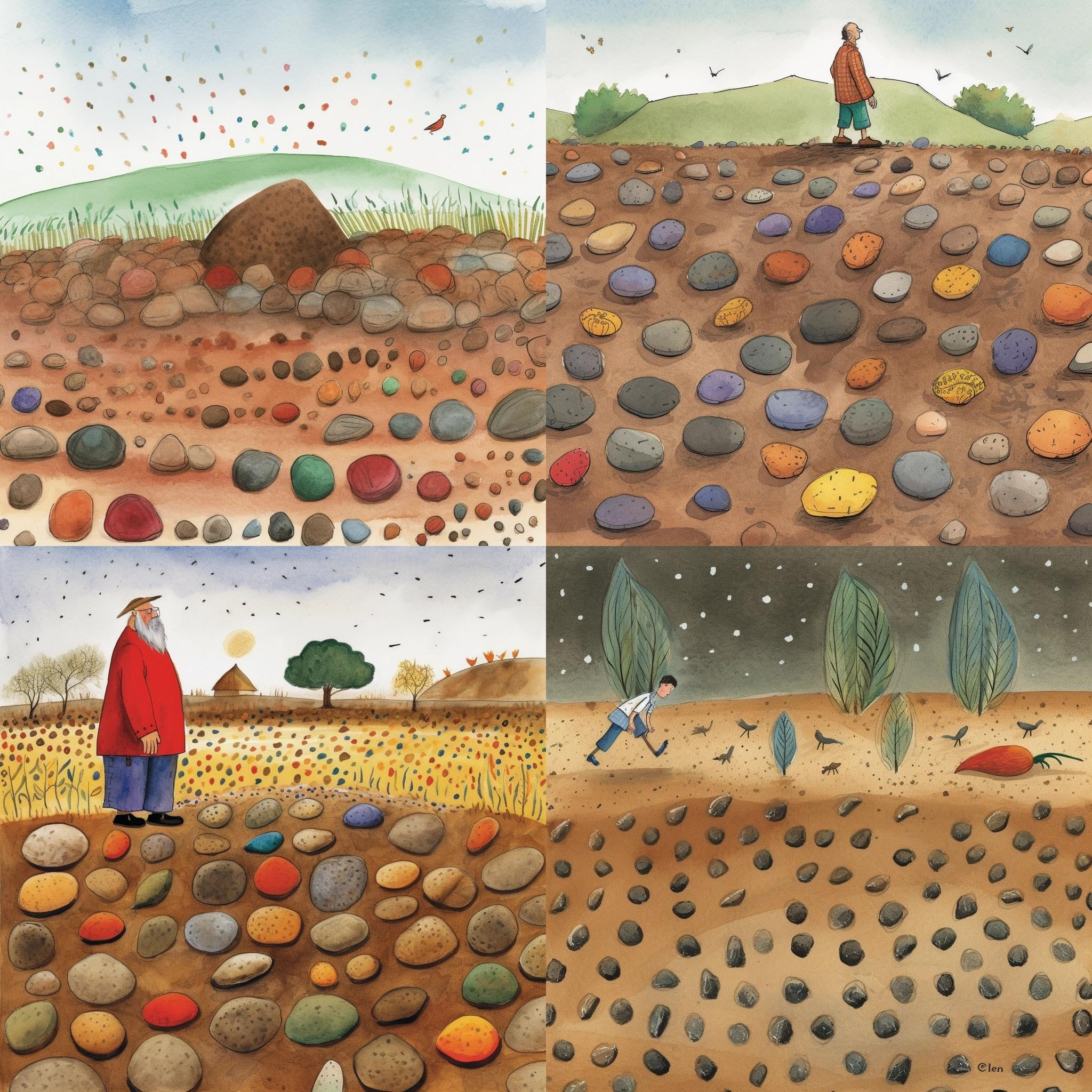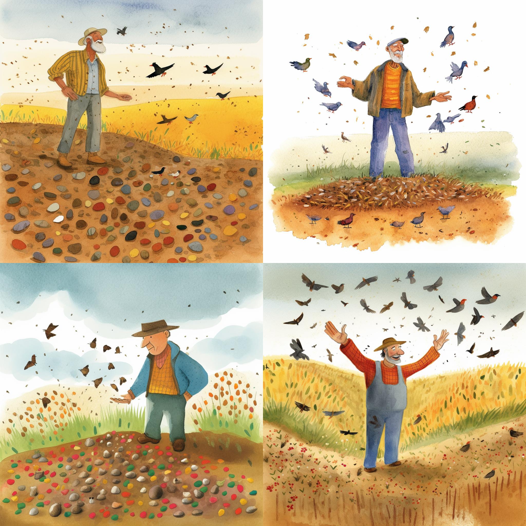 A friendly farmer stands in an open field, a handful of seeds in his hand. He scatters the seeds far and wide to sow a harvest. Behind him you can see four different soils: one rocky, one thorny, one surrounded by birds and one fertile. Illustration by Eric Carle --q 2 --v 5