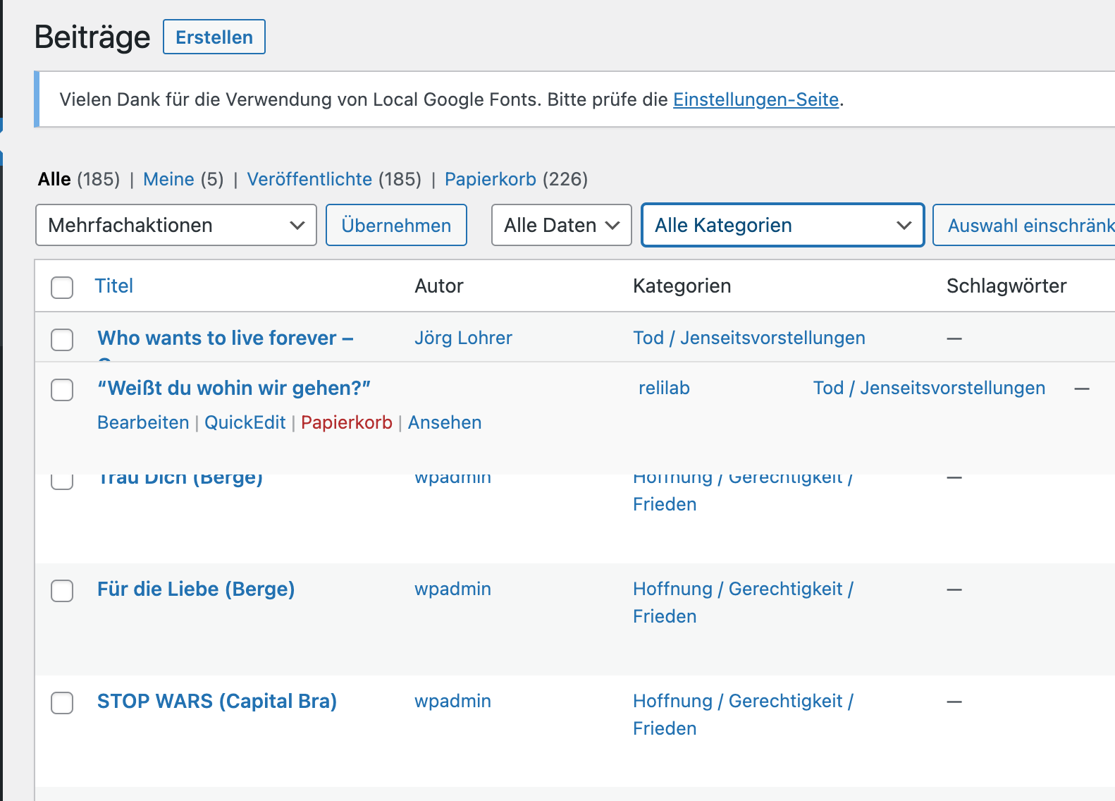 - einzelnen Spalten jetzt auch in jeweiligen Kategorienseiten aufrufbar : Mensch sein, Lebensweg, Liebe / Beziehung, Gemeinschaft, Belastungen, Hoffnung / Gerechtigkeit / Frieden, Wunder, Schöpfung, Die Frage nach Gott, Tod / Jenseitsvorstellungen, Biblische Geschichten, Songs zum Kirchenjahr