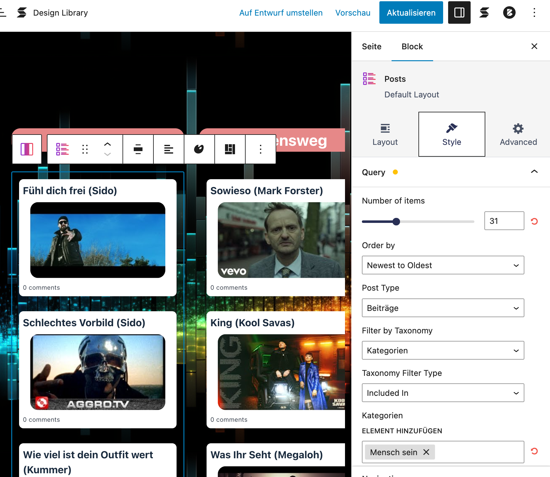 Es gibt wieder eine Vielzahl von WordPress-Blöcken, die Beiträge (posts) nach Kategorien sortiert in Spalten anzeigbar machen. Hier wurde “posts block” wiederum von Stackable benutzt.